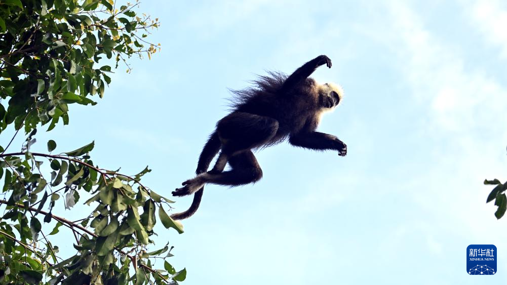 一只白头叶猴在林间跳跃(8月5日摄)。