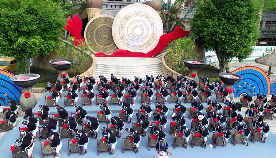 当天,南丹“瑶望天下”景区广场上千面铜鼓敲响,欢快的鼓声庆祝国家级铜鼓文化(河池)生态保护区通过评估验收。南丹县是保护区的核心区之一,铜鼓文化在南丹已有2000多年历史,在传统节日、节庆活动等重要时刻,当地少数民族群众都有打铜鼓的习俗,表达美好的祝福之意。