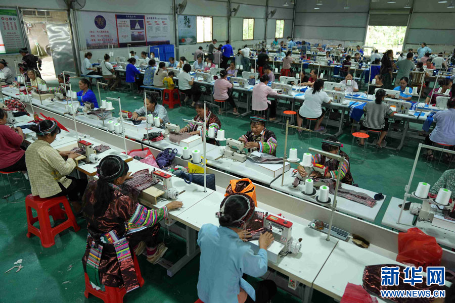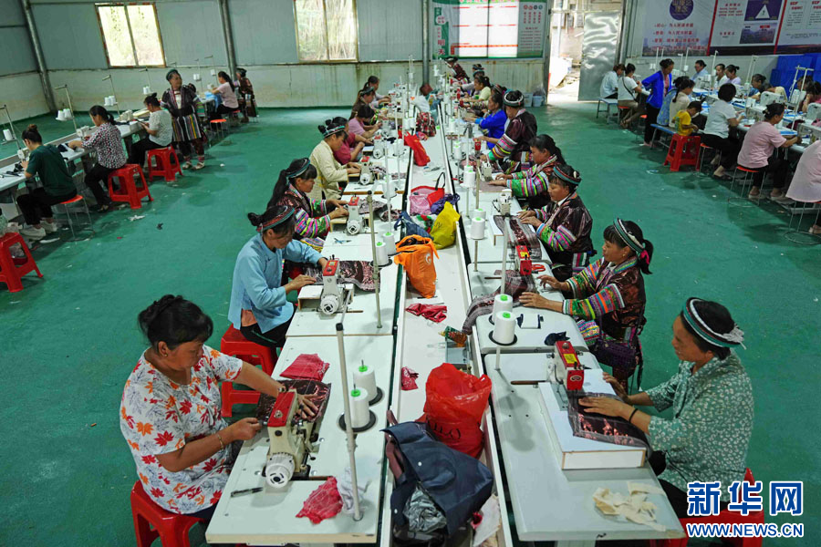 在融水洞头村洞头轻纺就业帮扶工厂,农家女在各自的岗位上忙碌。