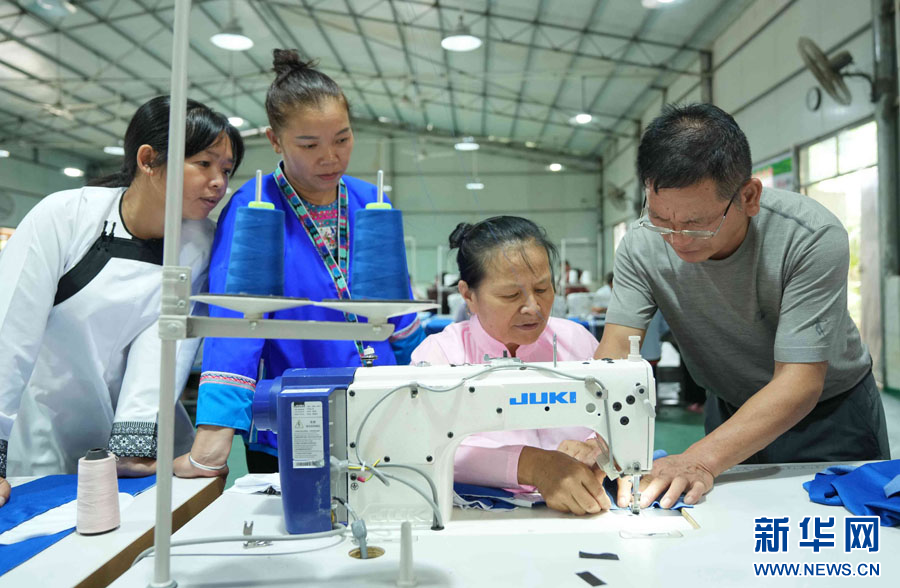 在融水洞头村洞头轻纺就业帮扶工厂,技术员(右)指导一位刚上岗的农家女缝制衣服。