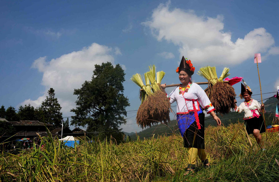 在广西柳州市融水苗族自治县红水乡,村民把刚剪下的糯稻带到田埂准备扎成禾把。