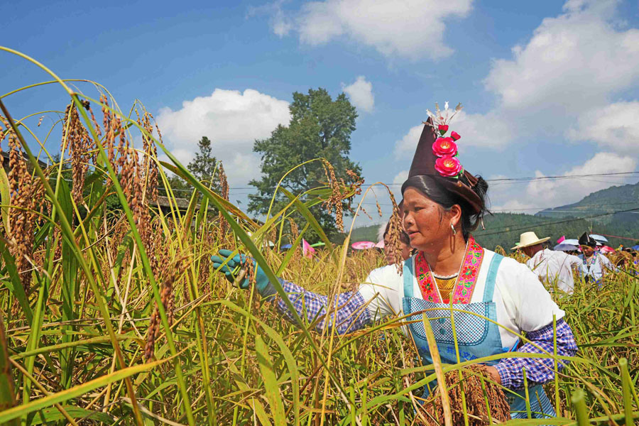 在广西柳州市融水苗族自治县红水乡,村民在田间剪禾。