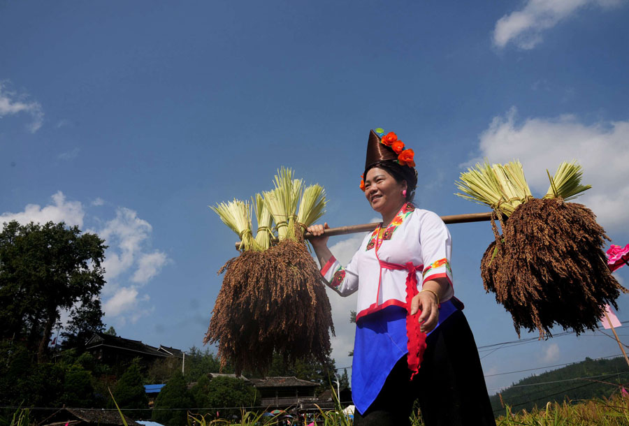 在广西柳州市融水苗族自治县红水乡,一位村民把禾把挑回家。