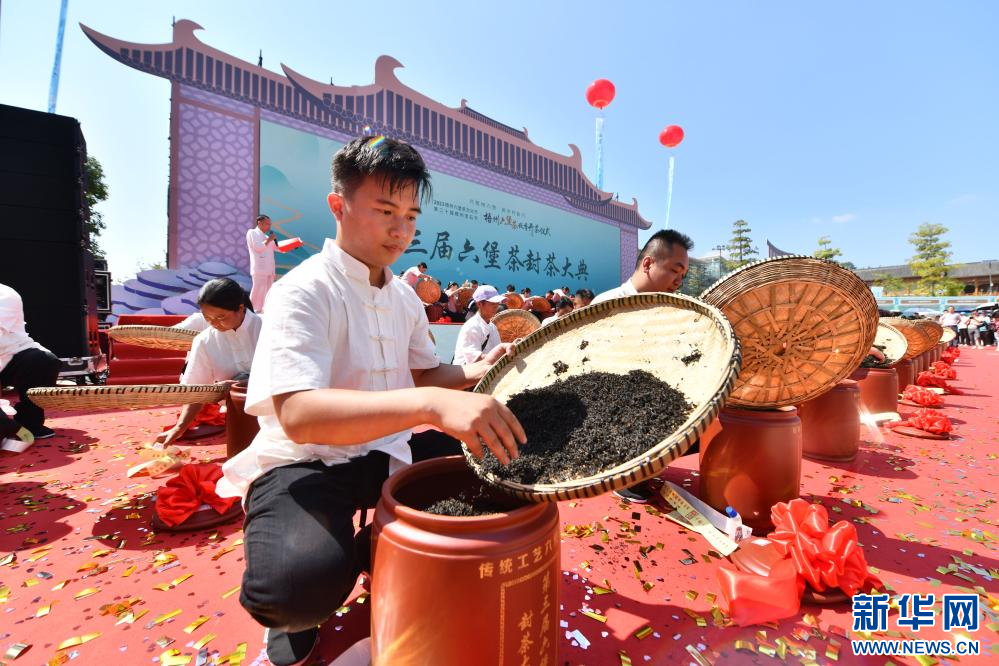 10月15日,在梧州市苍梧县六堡镇六堡茶文化广场,当地制茶人进行封茶仪式。