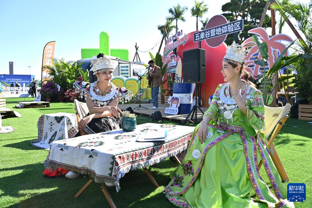 11月18日,两名身着民族服装的姑娘在汽车营地展区体验。