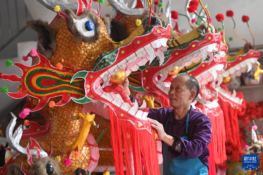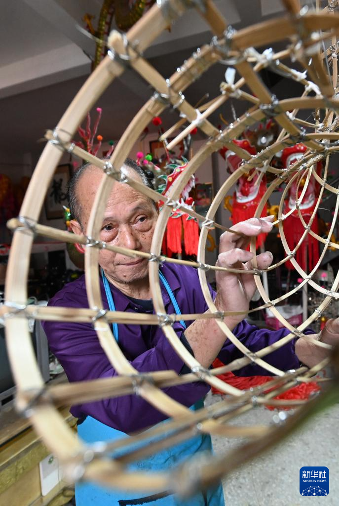 春节临近,在广西宾阳县宾州镇,手艺人邹玉特每天都坐在一堆“龙”中间,扎制炮龙。