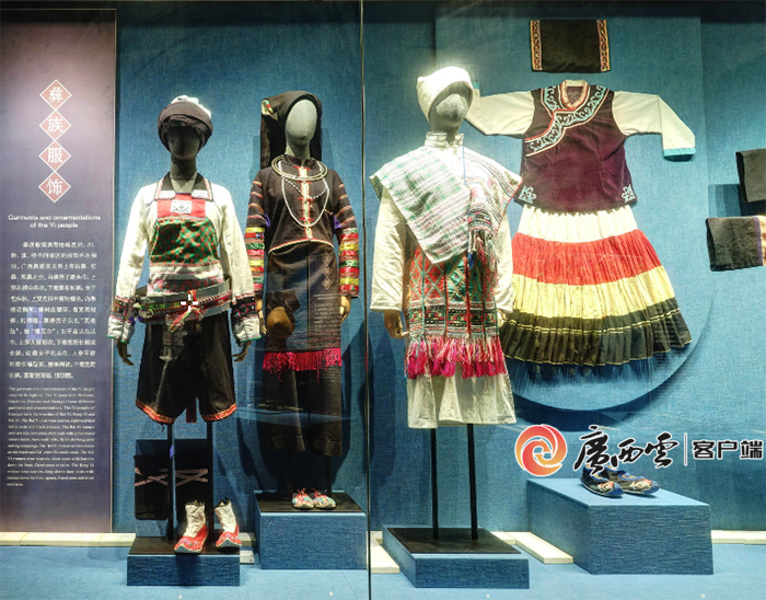 广西民族博物馆展出的彝族服饰。左1、2、3为那坡彝族服饰,右1为隆林彝族服饰。