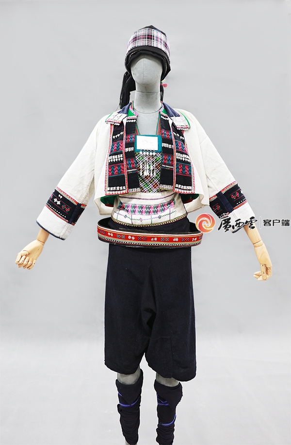 那坡彝族的服饰尚红、白两色。其中,尚白的一众彝族,主色调——白主要在上衣体现。女子一般身着白色无扣平脐对襟衣,在胸兜、袖口处点缀黑、红两色绣花,腰身系同款绣花大腰环,整体观感简约朴实。此外,女子还会戴黑头帕或花头格巾,颈部挂方形银牌,作为衣饰点缀。