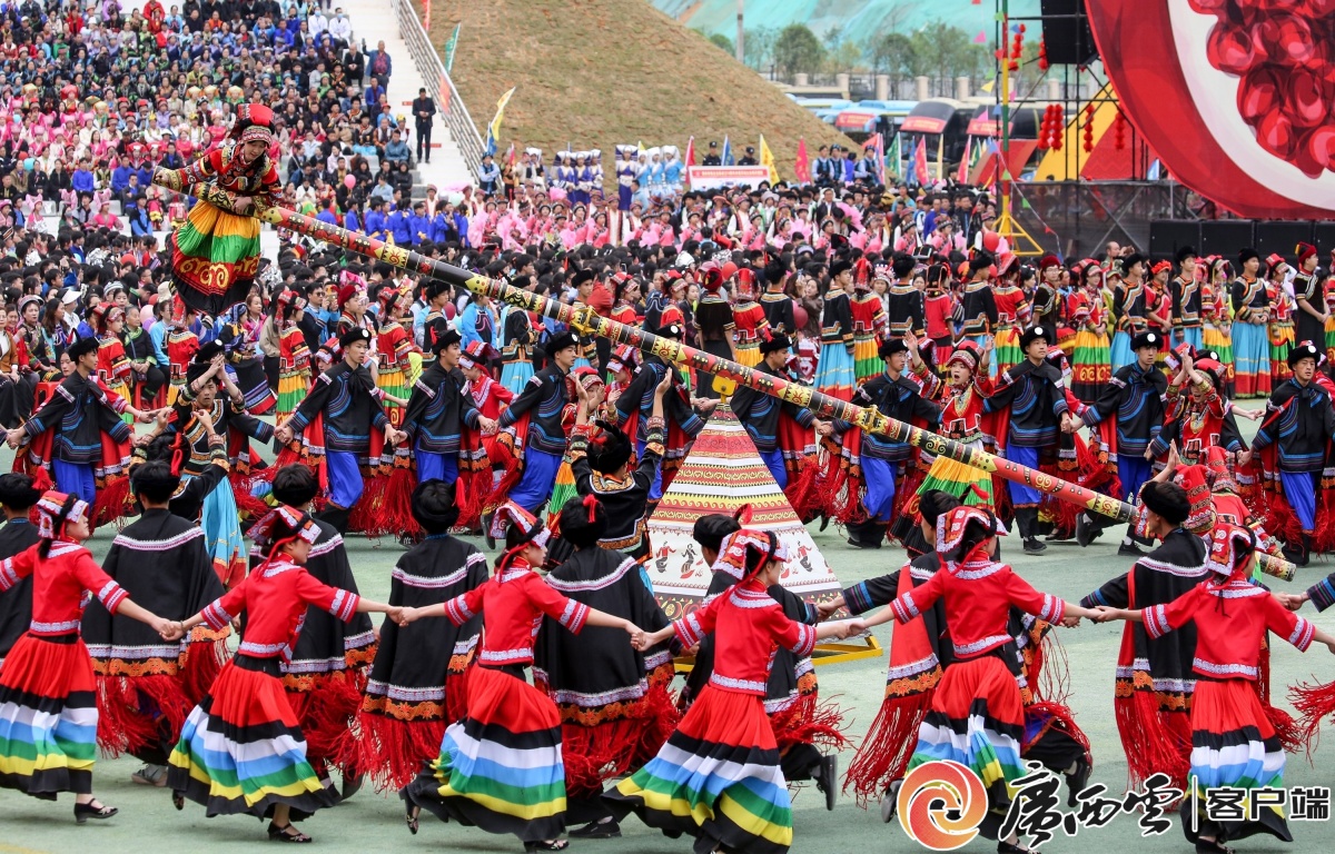 2023年3月28日,隆林各族自治县迎来70华诞,当地各族群众穿上节日盛装,举行大型广场文艺演出,尽情展示民族文化的魅力。图为彝族同胞展示独有的体育活动“打磨秋”。林斌 摄