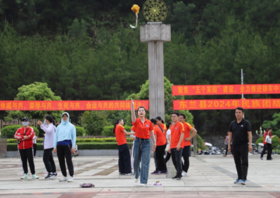 在比赛活动现场,背篓绣球、旱地龙舟等民族体育和趣味运动妙趣横生,参赛队员们团结协作、配合默契,共同展现运动的魅力。 (覃莉娱)