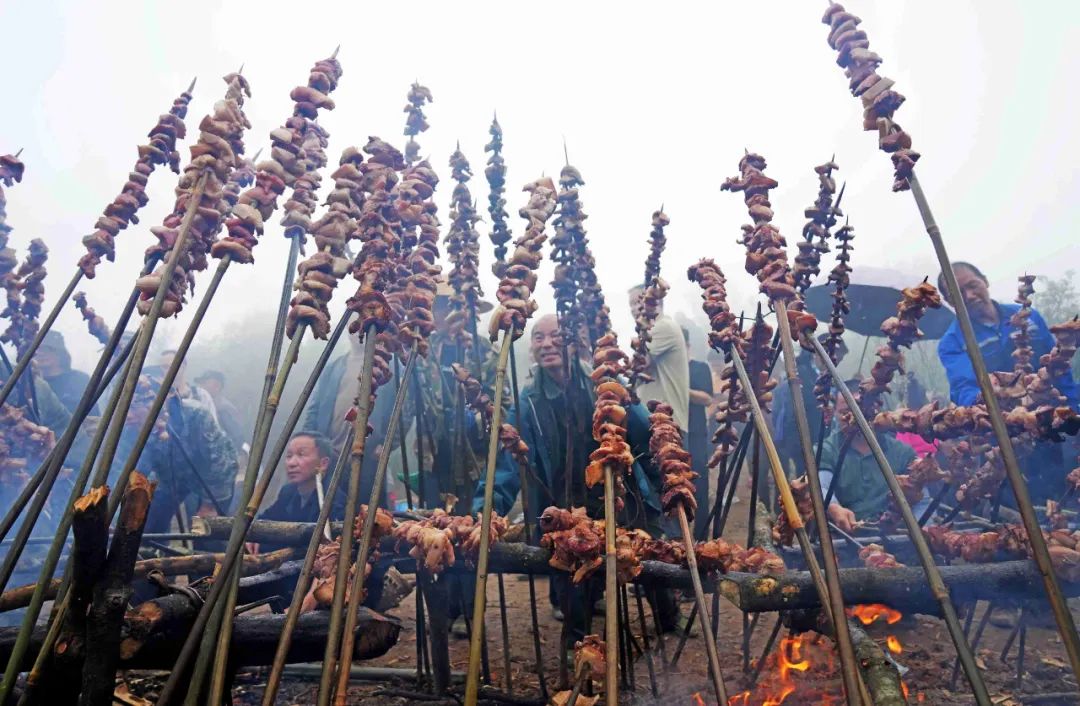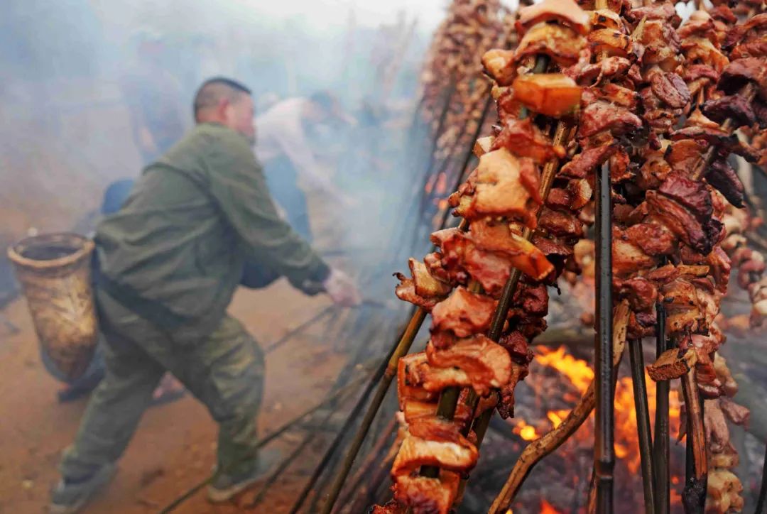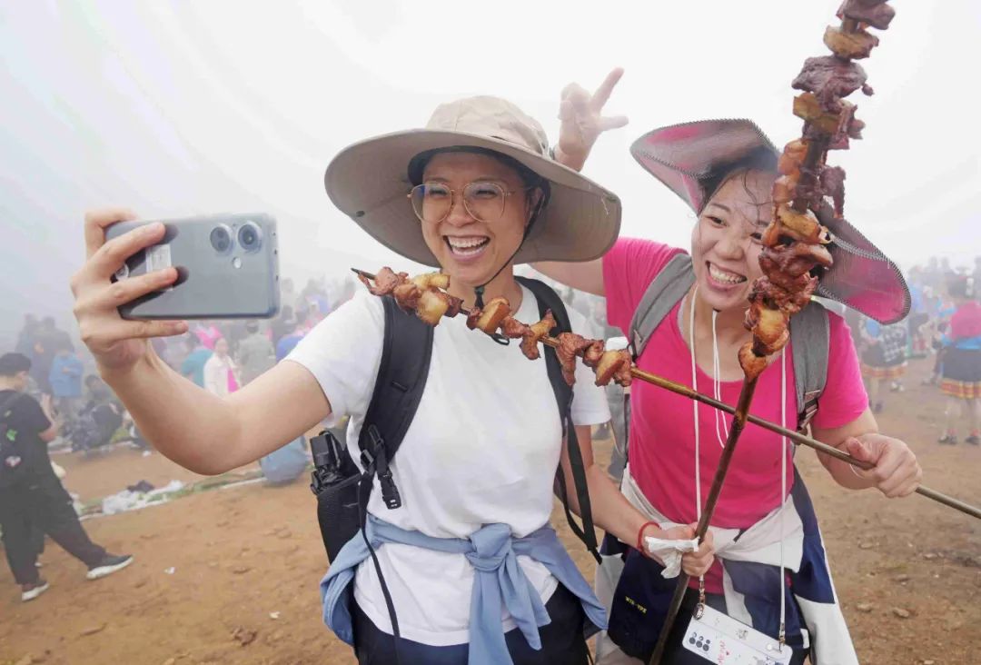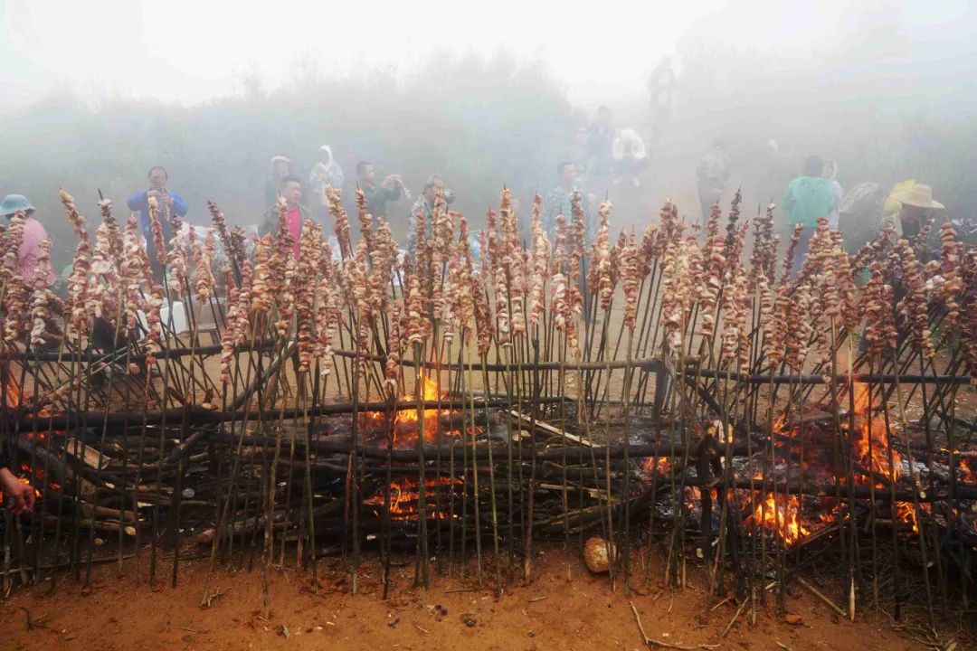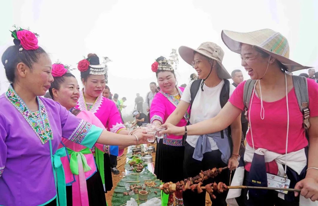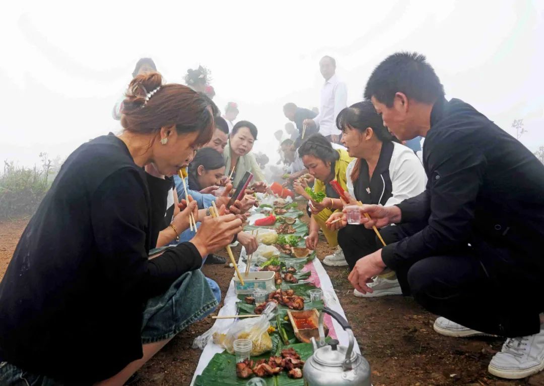 中午,当地村民和游客一起烧烤、吃糯米饭、喝农家米酒,感受独特的烟火气息,现场其乐融融。
