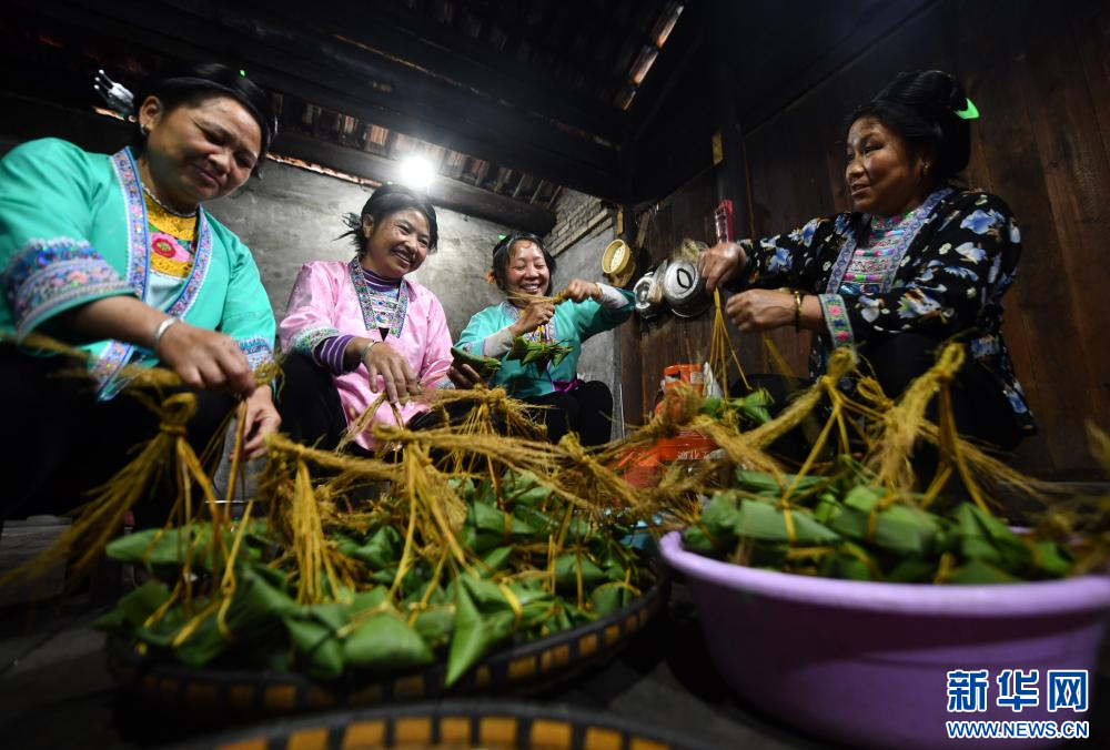 6月5日,在桂黔乌英苗寨,妇联干部和妇女在包粽子。
