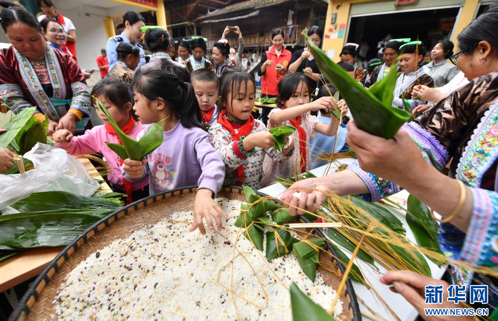 6月5日,在桂黔乌英苗寨,小学生们在学习包粽子。