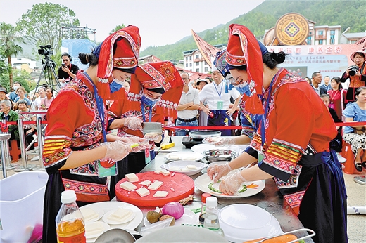 6月8日,来宾市第二届中医药壮瑶医药药膳大赛在金秀瑶族自治县举办。42支参赛队伍同场竞技,展示药膳烹饪技艺。图为壮族选手制作壮族药膳美食。 本报记者 李 晟 通讯员 廖雨晨/摄