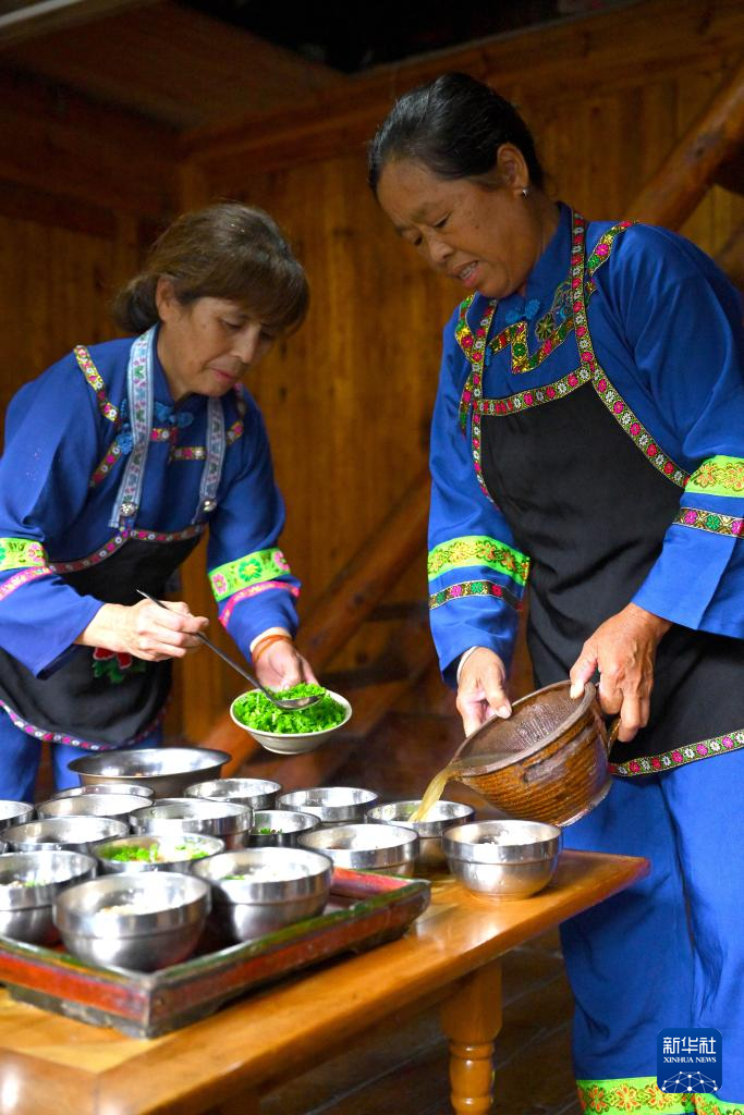 在广西龙胜各族自治县伟江乡布弄村,村民蒙银花(右)和蒙己秀在为客人调配油茶(6月26日摄)。