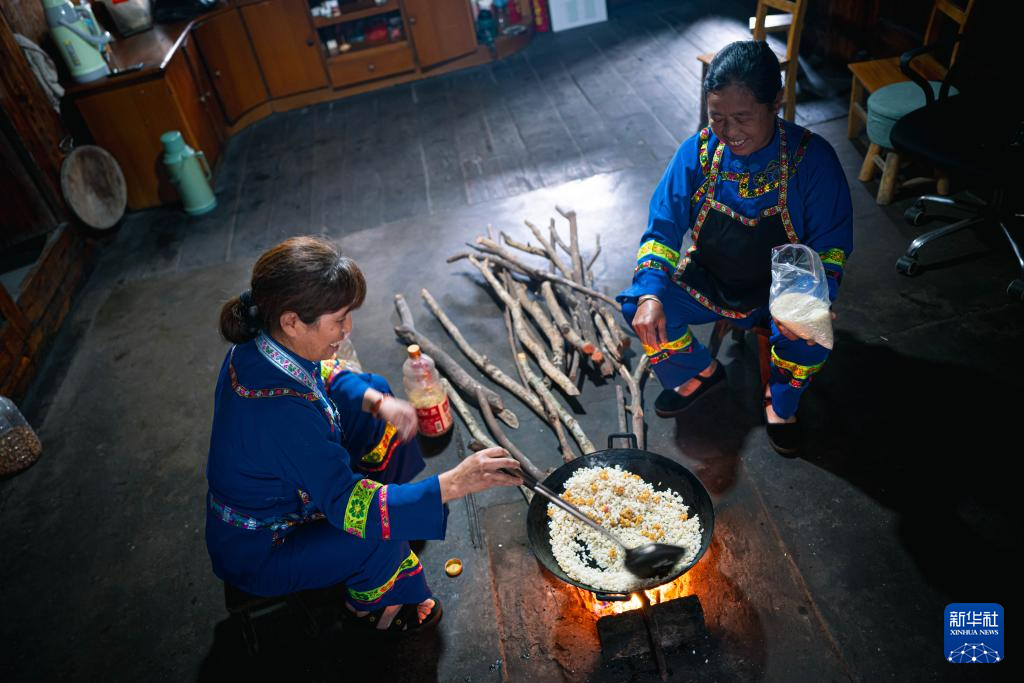 在广西龙胜各族自治县伟江乡布弄村,村民蒙己秀(左)和蒙银花在炒米花准备打油茶(6月26日摄)。