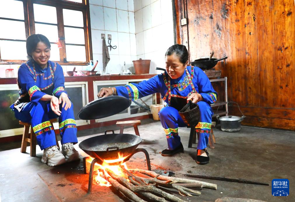 在广西龙胜各族自治县伟江乡布弄村,村民蒙银花(右)和蒙己秀在炒制油茶佐料(6月26日摄)。