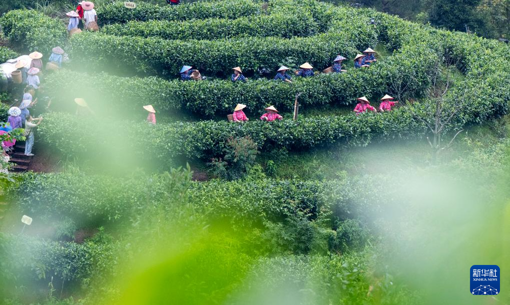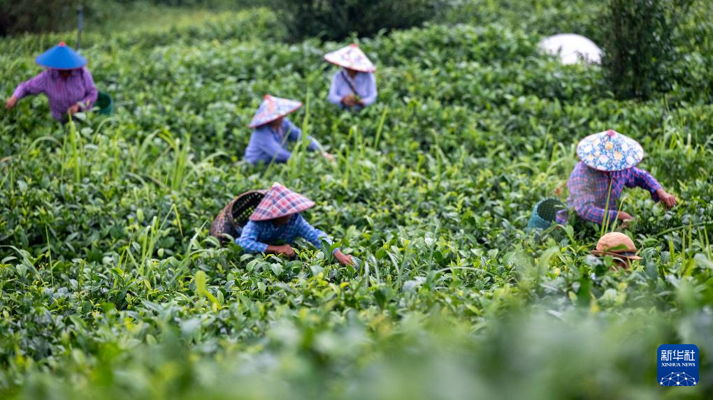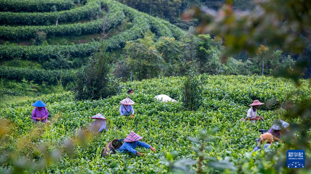 2024年7月28日,广西梧州岑溪市南渡镇井河村百福山有机生态茶园,茶农忙着采收夏茶,供应市场。近年来,南渡镇依托独特的地理位置和气候条件,以“党支部+合作社+茶农”模式大力发展茶产业,打造成了一井一河一茶园特色茶旅文创、休闲农业示范体验基地,通过茶旅融合、茶产融合延伸产业链,有效带动广大村民在家门口就业增收,助力乡村振兴。