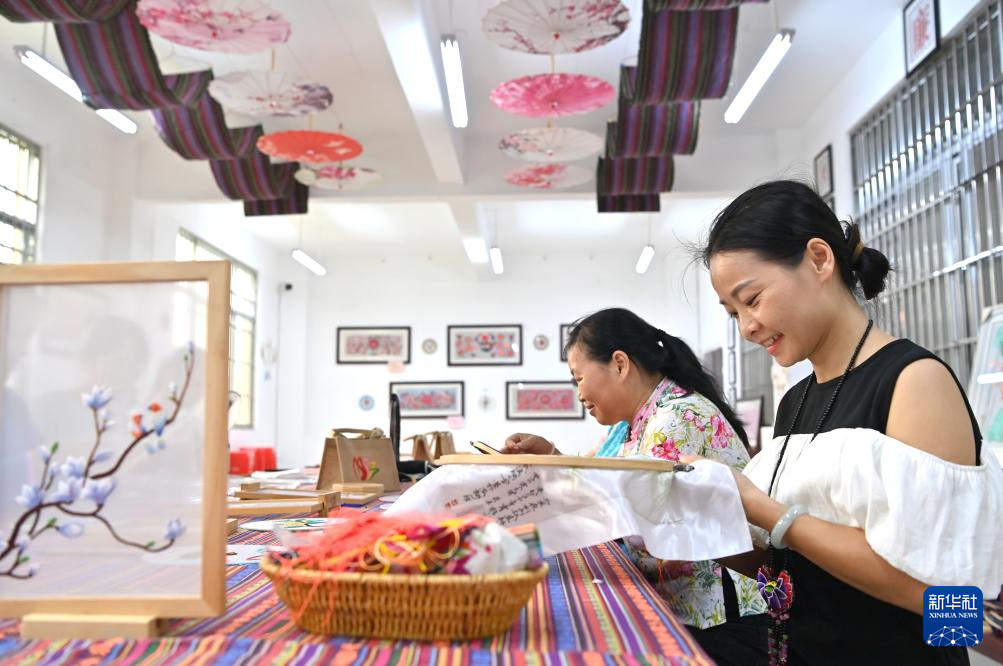凌漫丽(右)在田东县义圩镇七里刺绣基地做刺绣(8月20日摄)。