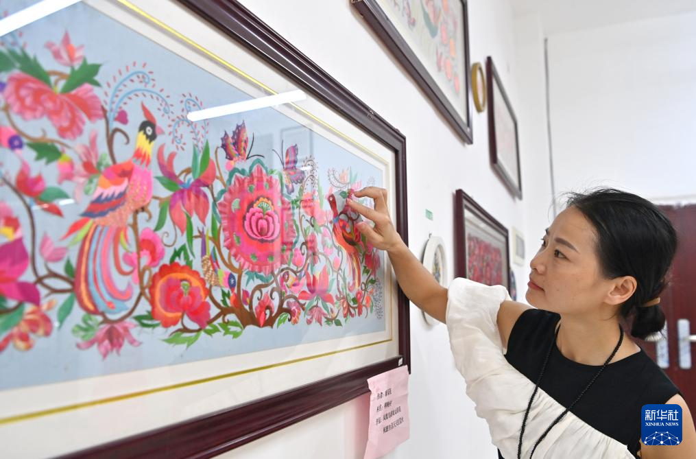 凌漫丽在田东县义圩镇七里刺绣基地展示她和村民制作的工艺品(8月20日摄)。