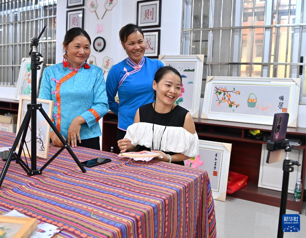凌漫丽(右一)在田东县义圩镇七里刺绣基地和村民一起做直播(8月20日摄)。