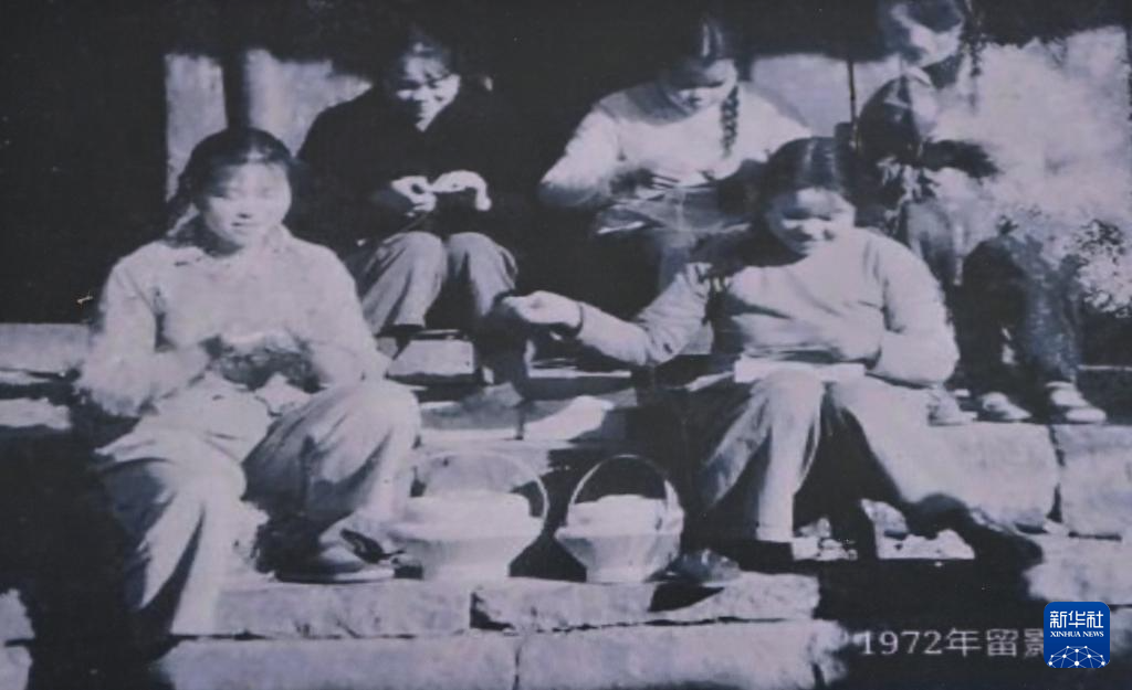 这是梁秀群(左一)1972年在百色市田阳区巴别乡三坡村和邻居编织麦秆花篮(8月21日翻拍)。