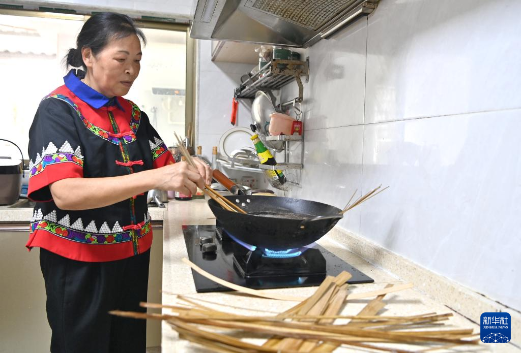 梁秀群在百色市田阳区巴别乡三坡村自家灶台煮竹篾(8月21日摄)。