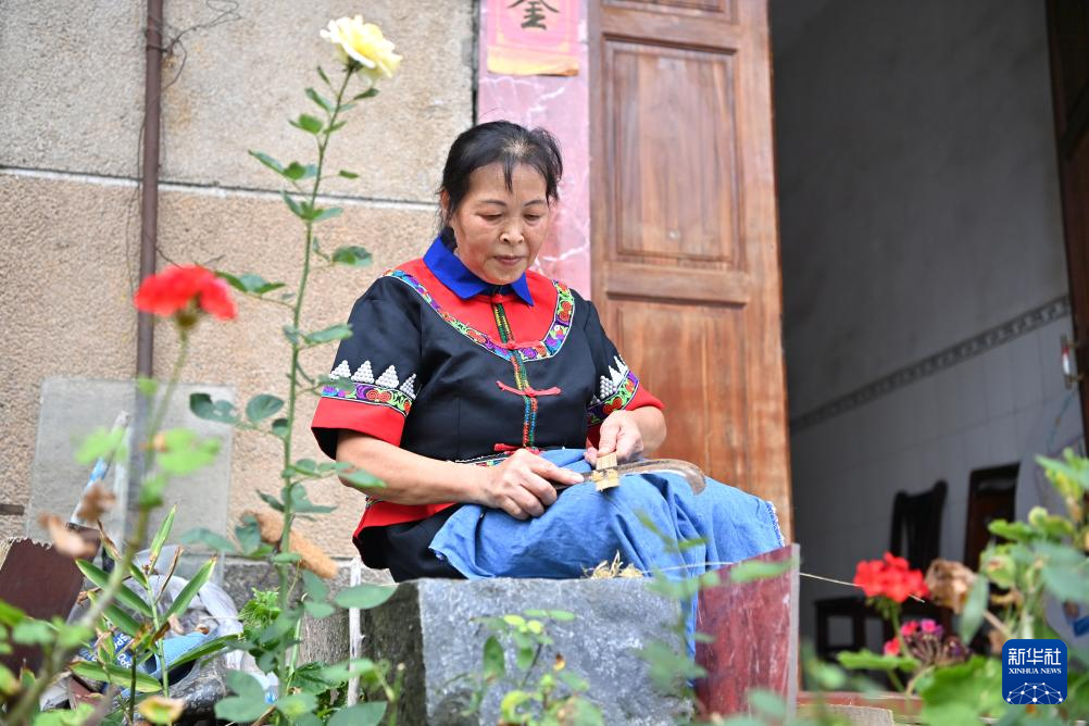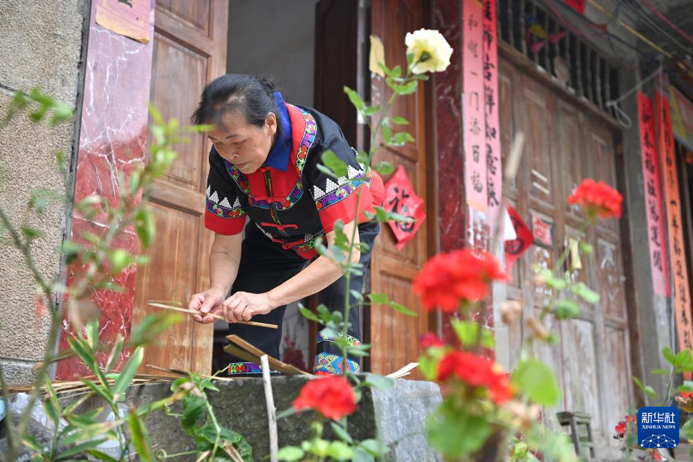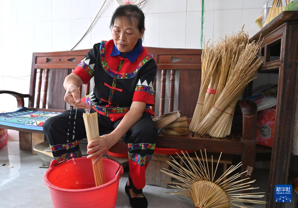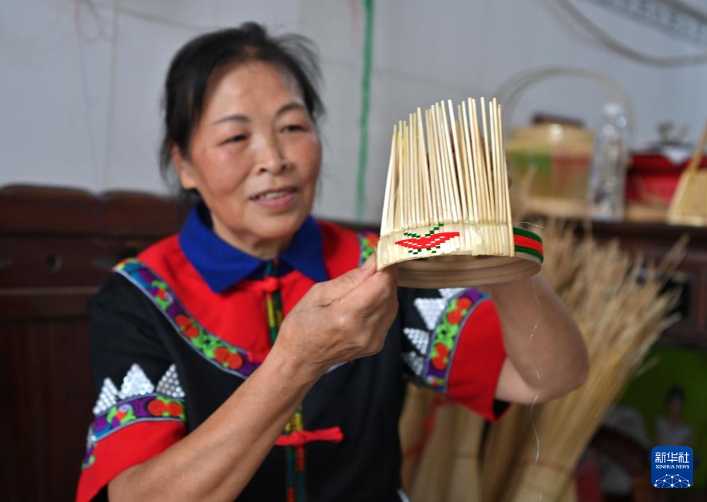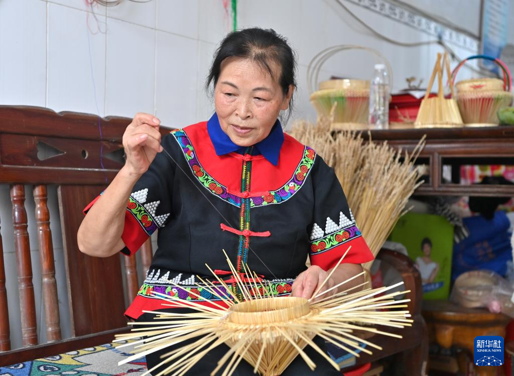 梁秀群在百色市田阳区巴别乡三坡村编织麦秆花篮(8月21日摄)。