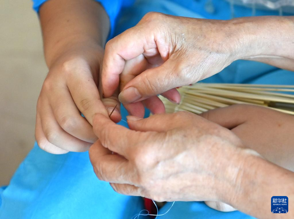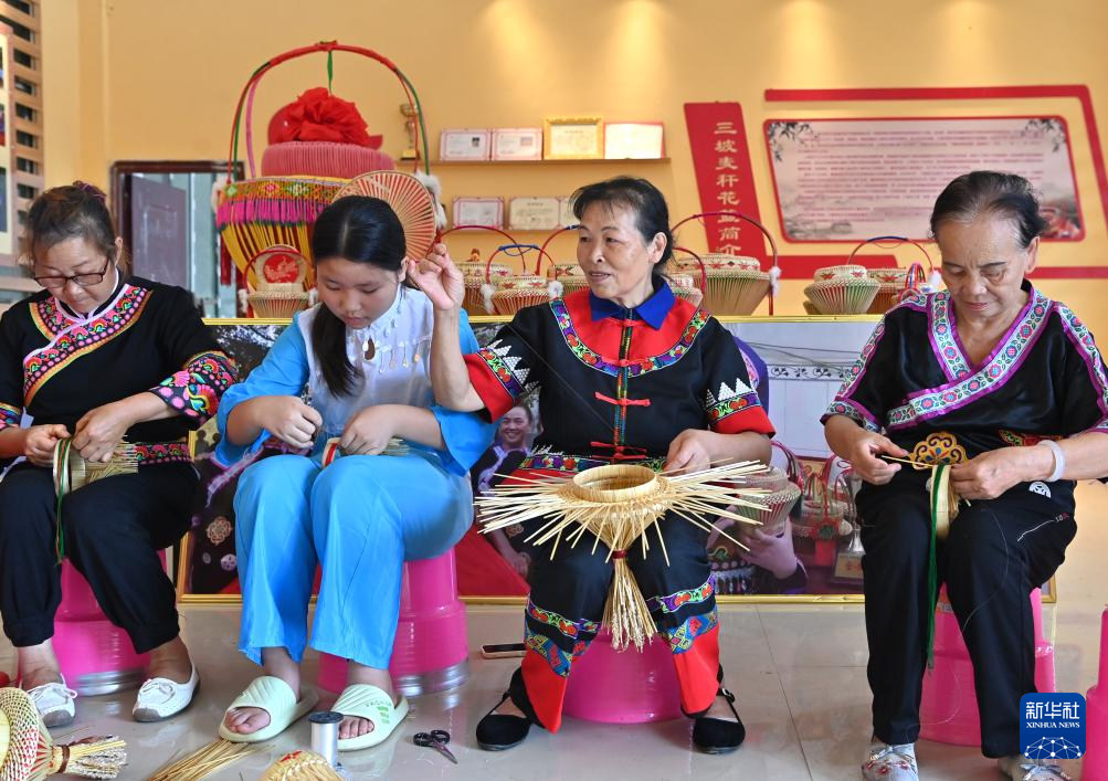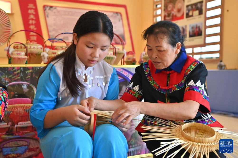 梁秀群(右)在百色市田阳区巴别乡三坡村民俗文化传承馆教14岁的陆新睿编织麦秆花篮(8月21日摄)。