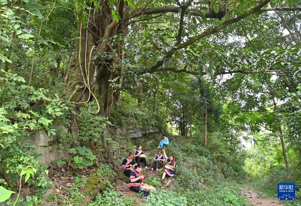 梁秀群在百色市田阳区巴别乡三坡村大榕树下带着她的编织小队编织麦秆花篮(8月21日摄)。