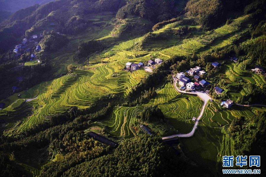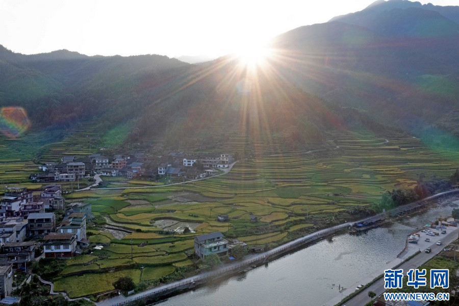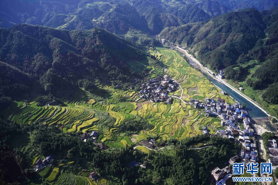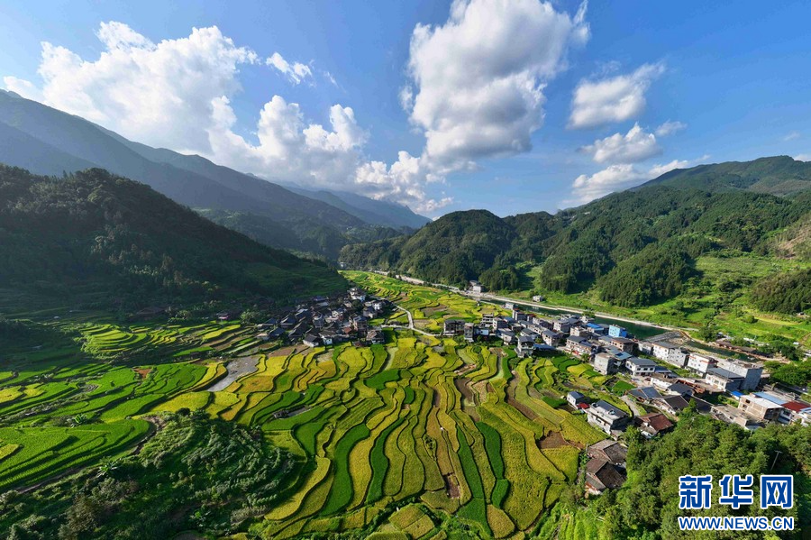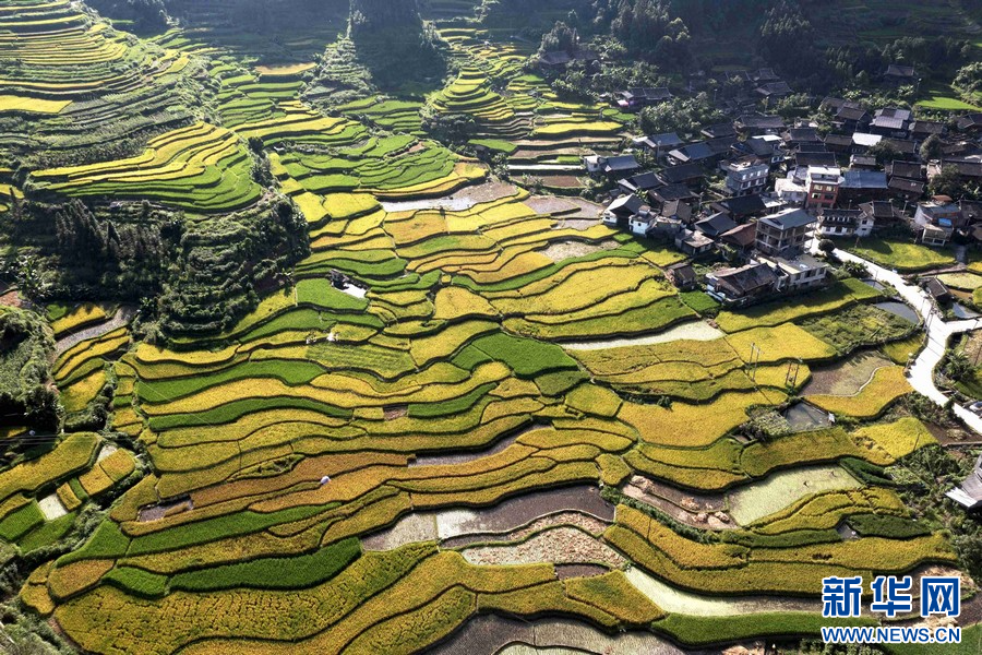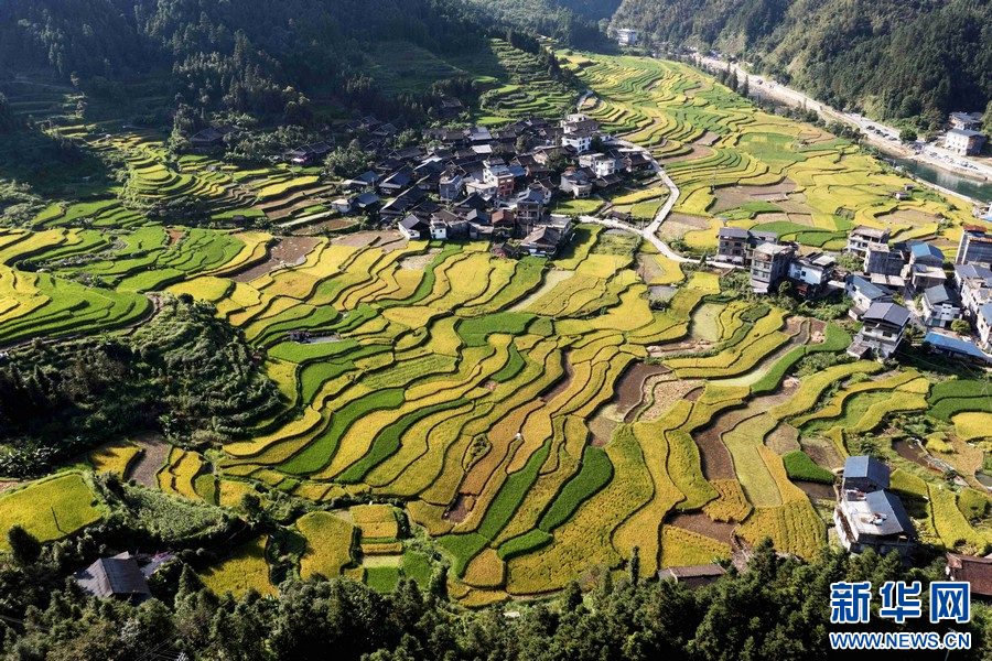 时下,广西柳州市融水苗族自治县香粉乡雨卜村水稻陆续成熟,丰收在望,黄绿相间的田园美丽如画。