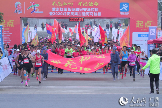 人民网兴安12月1日电 11月29日,2020年广西首个大型马拉松赛——“不忘初心、牢记使命“重走红军长征路兴安马拉松暨2020兴安灵渠古运河马拉松赛激情开跑。