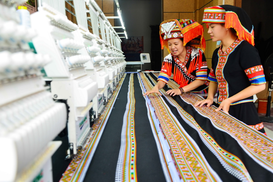 8月8日,在八步区一家瑶族文化体验馆,工人在查看绣花设备生产运行情况。