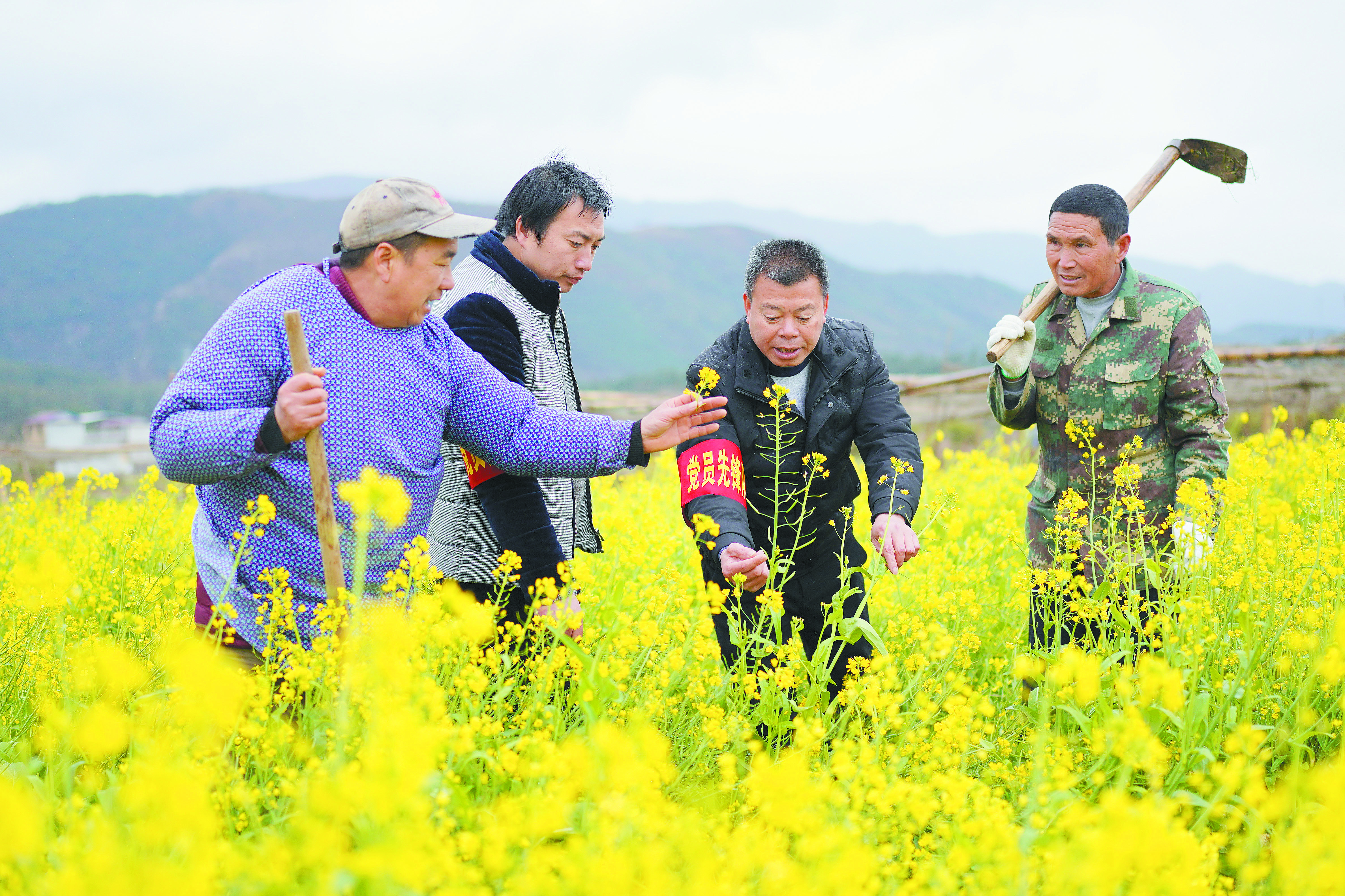 ①2月17日,在灵川县三街镇龙坪村,党员农技员正在指导村民管护油菜花。黄勇丹 彭芊程 摄