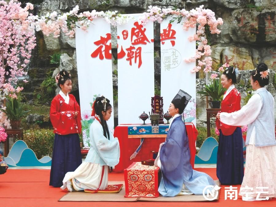 南宁云—南宁晚报讯(记者赵金玲)昨日,南宁园博园开展礼乐园博·南宁花朝盛典开启国风之约,汉服爱好者汇聚一堂,向游客展现汉服艺术文化的神韵,传承民族特色文化。据悉,南宁园博园民族风活动将持续进行,4月16日前的每个周末及“壮族三月三“假期期间都有精彩内容。