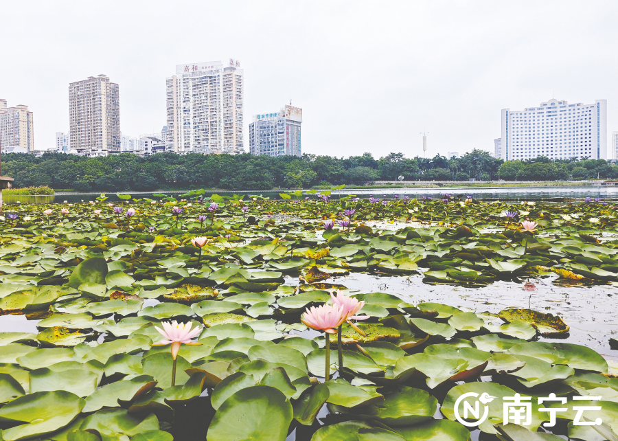 炎炎夏日,碧波荡漾,一朵朵美丽的睡莲轻舞花叶,令人心旷神怡。记者近日来到南宁南湖公园清莲湾看到,满池睡莲热烈绽放,五曲桥上市民游客前来“打卡”,欣赏这幅美丽的城市夏日画卷。南湖公园睡莲热烈绽放。记者 梁枫 摄 粉色、紫色、淡黄色……斑斓的色彩在湖面上铺陈开来...