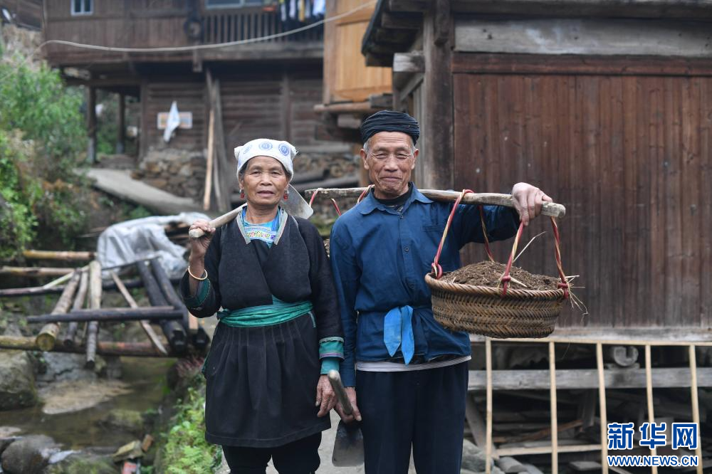 2017年11月,我第一次来到乌英苗寨。在古色古香的村落里,一对身着苗衣、肩扛农具的老人,肩并肩慢慢地走着。 我没有贸然按下快门,不忍打扰这美好动人的时刻。卜老右(右)和卜金迷(2017年11月7日摄)。 老人看见我,笑眯眯地跟我打招呼。阿姨不会讲普...