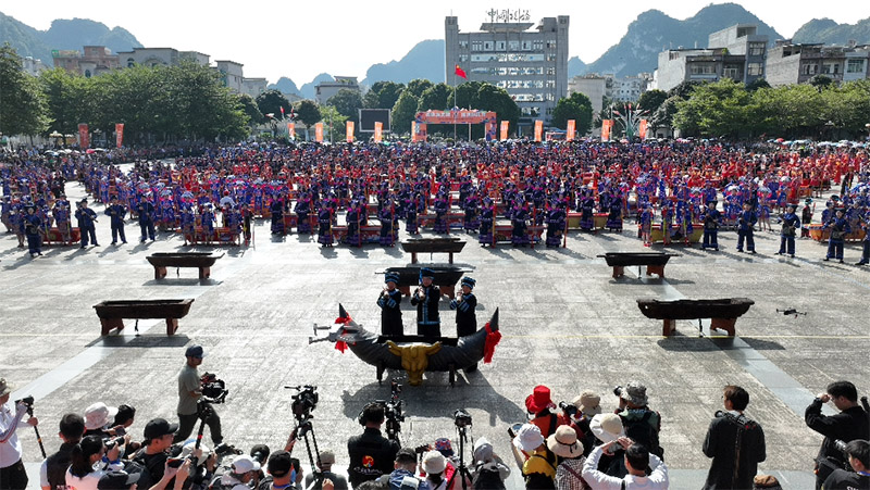10月24日,2023年天等县世界非遗壮族霜降节系列活动在该县天椒广场开幕。开幕现场,当《打榔舞》的音乐声响起时,上千椒乡儿女纷纷挥起木杵敲击木榔,欢歌载舞庆祝节日。天等人民身着民族盛装聚集在广场上跳起打榔舞,载歌载舞共庆世界非遗壮族霜降节。天等县融媒体中心供图欢歌载舞庆祝节日。人...