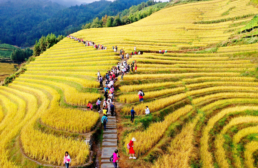 游客在景区观光游览。潘志祥摄游客在景区观光游览。潘志祥摄金黄色梯田。潘志祥摄金黄色梯田。潘志祥摄游客在景区观光游览。潘志祥摄金黄色梯田吸引游客前来观赏。潘志祥摄金黄色梯田。潘志祥摄游客在景区观光游览。潘志祥摄层层叠叠的金黄色梯田。潘志祥摄 金秋时节,广西桂林龙胜各族自治县龙脊梯田水...