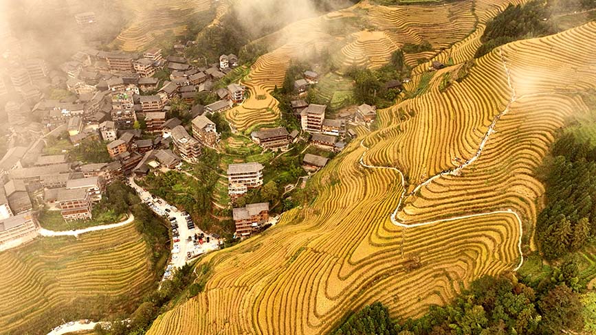 梯田金黄秋色浓游客欣赏梯田美景俯瞰龙脊梯田景区游客在梯田间观光游览航拍梯田层层叠叠的金色梯田层层叠叠的金色梯田层层梯田呈金黄色梯田金黄秋色浓 近日,广西桂林市龙胜各族自治县龙脊梯田景区迎来最佳观赏期,金色梯田、特色村寨、穿梭人影、缥缈云雾相互映衬,构成一幅幅迷人的金秋画卷,美...