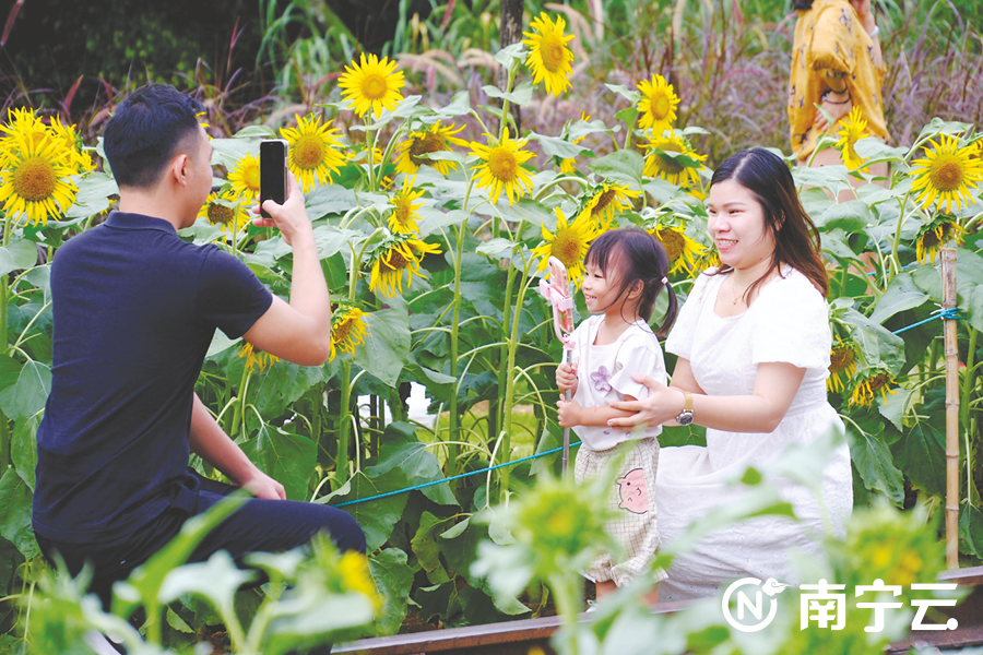 南宁云—南宁晚报讯(记者 凌剑伊)这个中秋、国庆“双节”假期,位于江南公园的一片向日葵花海迎来了盛花期。这片花海也成了市民游客的热门打卡地之一。据悉,这片向日葵花海8月初下地,现在进入了盛花期,有8000多株,栽种面积有1000多平方米。市民游客在向日葵花海中开心留影。记者 宋延...