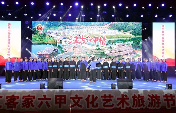 六甲山歌演出现场。芦笙独奏。舞蹈表演。舞蹈表演。 8月8日晚,三江侗族自治县第二届客家六甲文化艺术旅游节开幕式在该县古宜镇大洲村文化广场举行,当地群众以六甲山歌、民族舞蹈等丰富节目,倾情展现六甲多彩文化魅力,全力铸牢中华民族共同体意识,助推侗乡文化旅游高质量发展。...