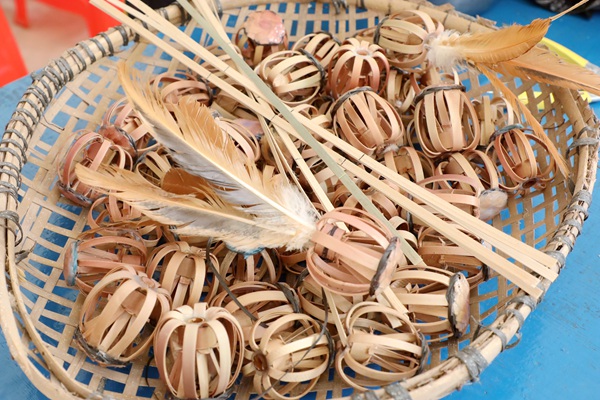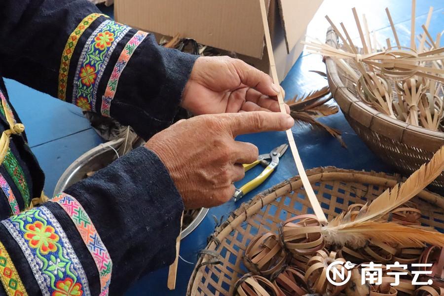 香火球的底座和制作完成的香火球。 鸡毛、竹篾、笋壳……简单的材料编织成了一个又一个精巧玲珑的香火球。在南宁市良庆区南晓镇晓元村古元坡,这份独特的手艺已经传承了300余年。7月14日,记者来到古元坡,近距离感受香火球独特的历史魅力。 香火球传承人班继联一边唱...