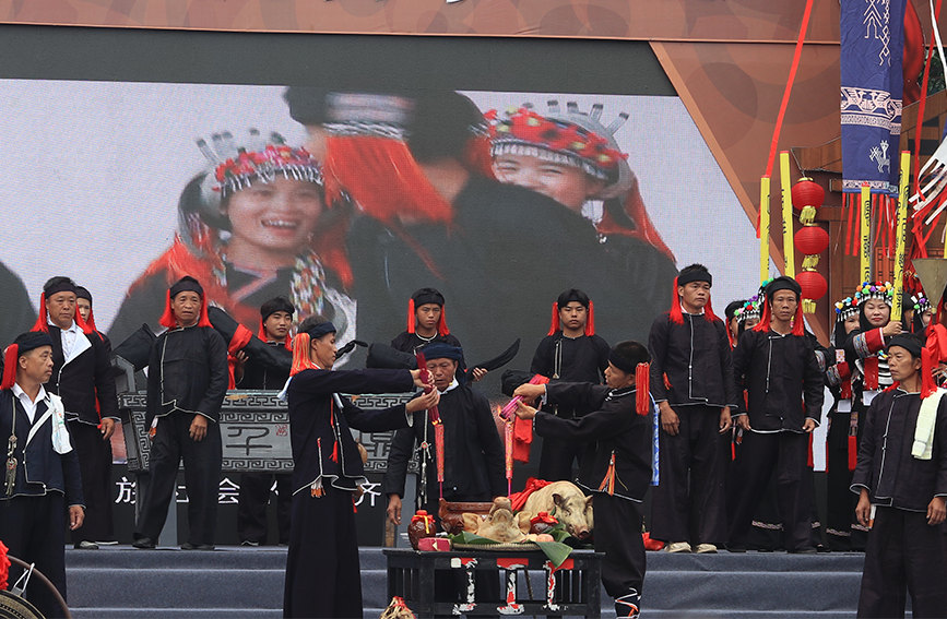 民俗活动展示。梁琼之摄 人民网南宁7月17日电 (陈燕、实习生梁琼之)唢呐齐鸣,铜鼓声声,七月瑶山迎贵宾,7月15日,2023年瑶族祝著节庆祝活动在巴马寿乡文化广场精彩开幕。活动旨在大力弘扬中华优秀传统文化和传承瑶族民俗文化,充分展示瑶族文化魅力和团结向上的精神风貌,营造起全社会共创全...