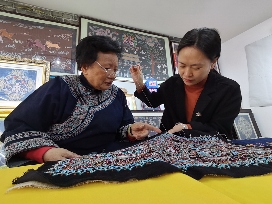 3月14日,在河池市罗城仫佬族自治县广西非物质文化遗产名录项目仫佬族刺绣传承人谢秀荣工作室,广西工艺美术大师谢秀荣(左)在向仫佬族姑娘传授刺绣技艺。仫佬族刺绣被列入广西非物质文化遗产名录以来,谢秀荣免费将刺绣技艺倾囊相授,目前已培训了3000多人,有54个徒弟学成出师,在各项赛事中斩获大奖,传承和发扬了仫...